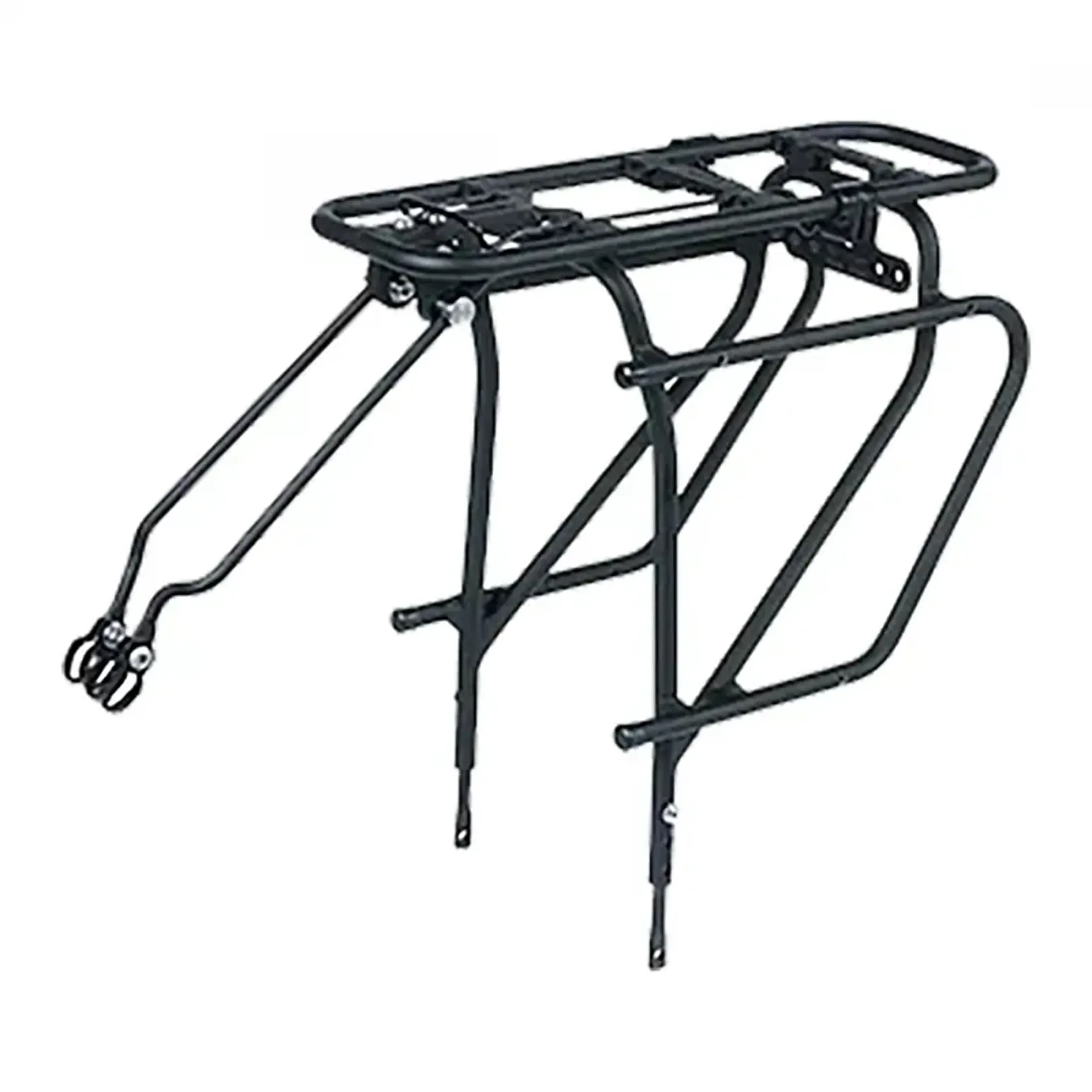 Universal rear cargo rack with integrated pannier bars and top clamping spring for a jacket or other loose lightweight gear.